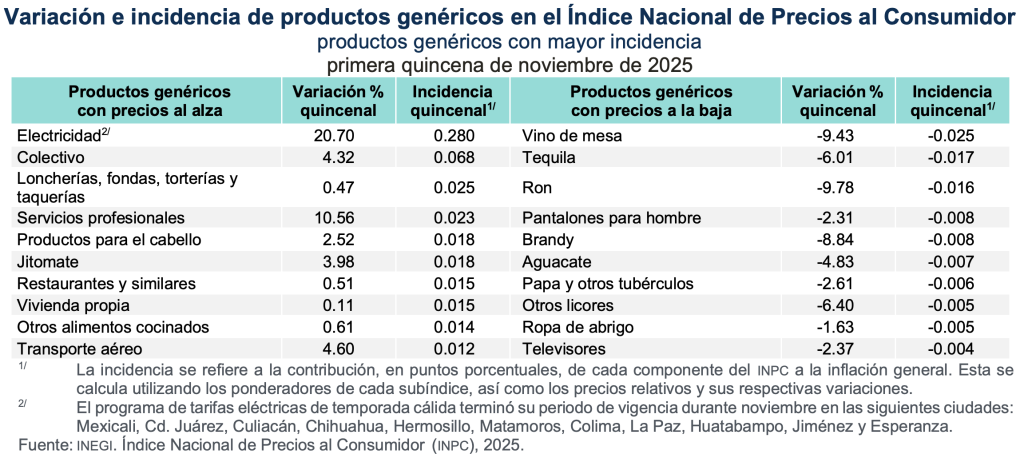 Un factor clave en este incremento quincenal fue la conclusión del subsidio al programa de tarifas eléctricas de temporada de verano en 11 ciudades del país, lo que generó un aumento del 2.92% en los precios de los energéticos y tarifas autorizadas por el gobierno. En contraste, la inflación subyacente (que excluye bienes de alta volatilidad) se mantuvo estable con una variación quincenal de apenas 0.04%. A su interior, los precios de los servicios subieron 0.25%, mientras que los de las mercancías registraron una deflación de -0.19%.