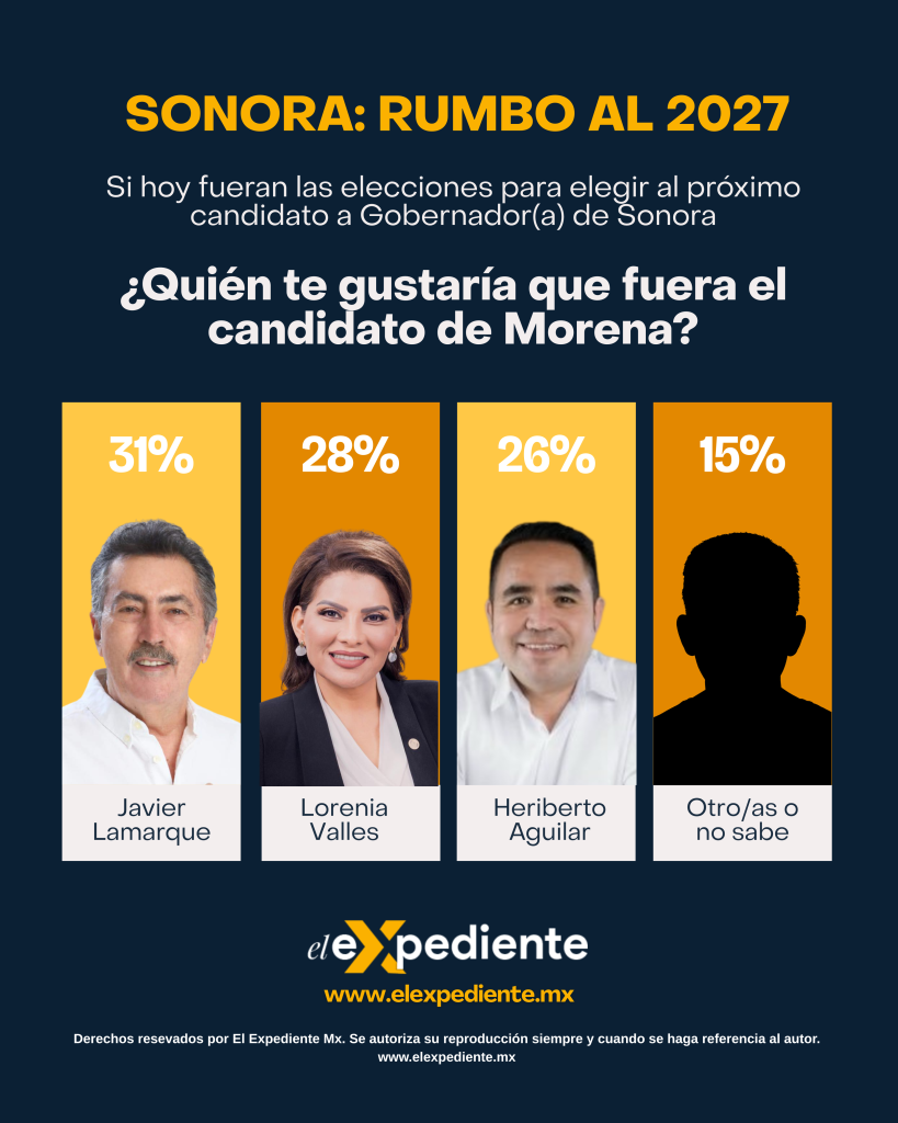 Sin categoría Sonora rumbo al 2027 elexpediente Nov 29, 2025 Estos son los resultados de una encuesta del portal de comunicación www.elexpediente.mx en relación a los aspirantes de Morena a la candidatura a gobernador del Estado.