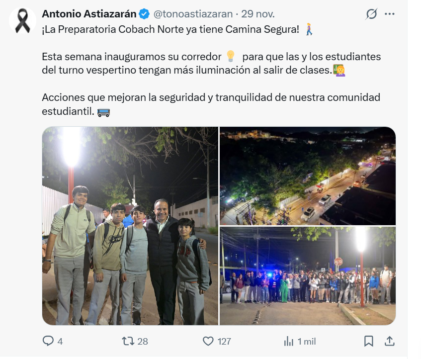 Hermosillo, Sonora, 30 de noviembre de 2025. – El presidente municipal de Hermosillo, Antonio Astiazarán, inauguró esta semana el corredor “Camina Segura” en la Preparatoria Cobach Norte. La iniciativa incluye mayor iluminación para los estudiantes del turno vespertino, mejorando la seguridad y tranquilidad al salir de clases. Astiazarán destacó que estas acciones fortalecen la comunidad estudiantil, acompañadas de una foto grupal con alumnos y autoridades locales. La obra ha recibido elogios por su impacto en la movilidad nocturna y la protección de los jóvenes.