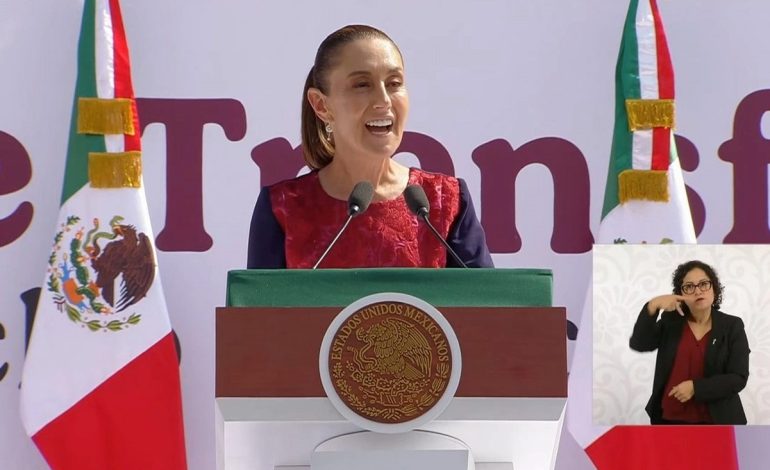 “Claudia apenas tiene un año. Estamos festejando 6 años de Andrés Manuel y un año de Claudia, son 7. Estamos festejando 7 años. Hasta ahorita Claudia se ha rifado como las grandes, ya ha puesto el nombre de México en alto. Ayer mismo, allá en Washington.